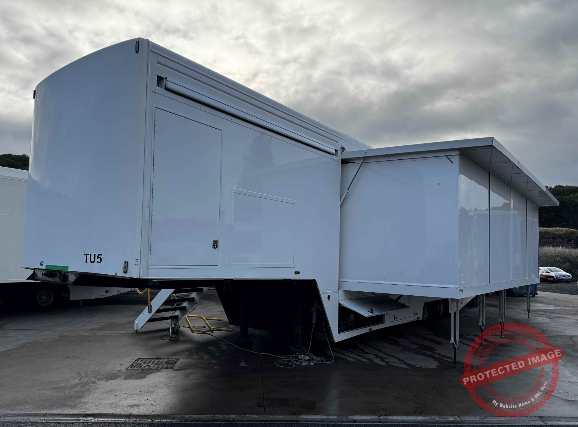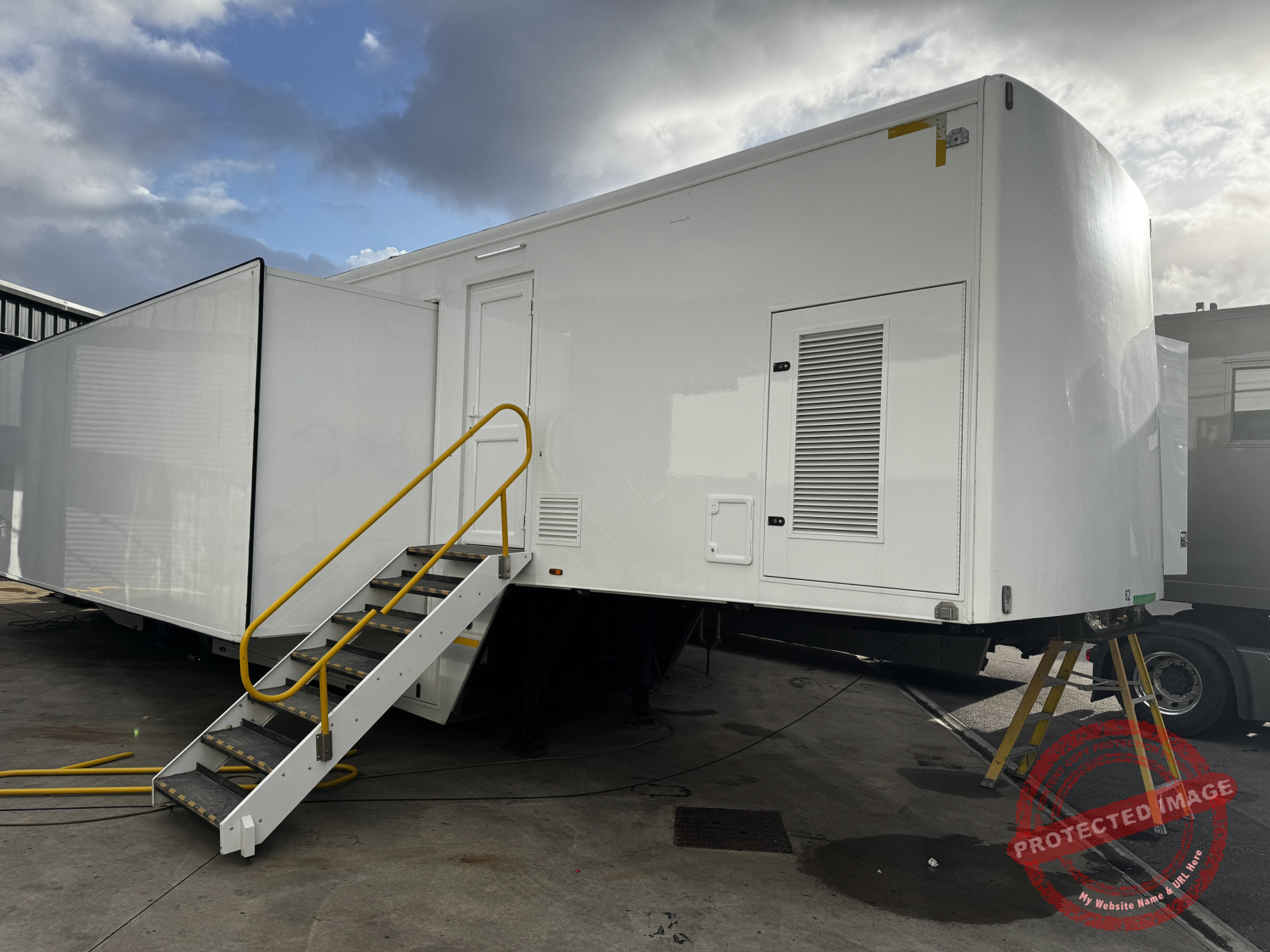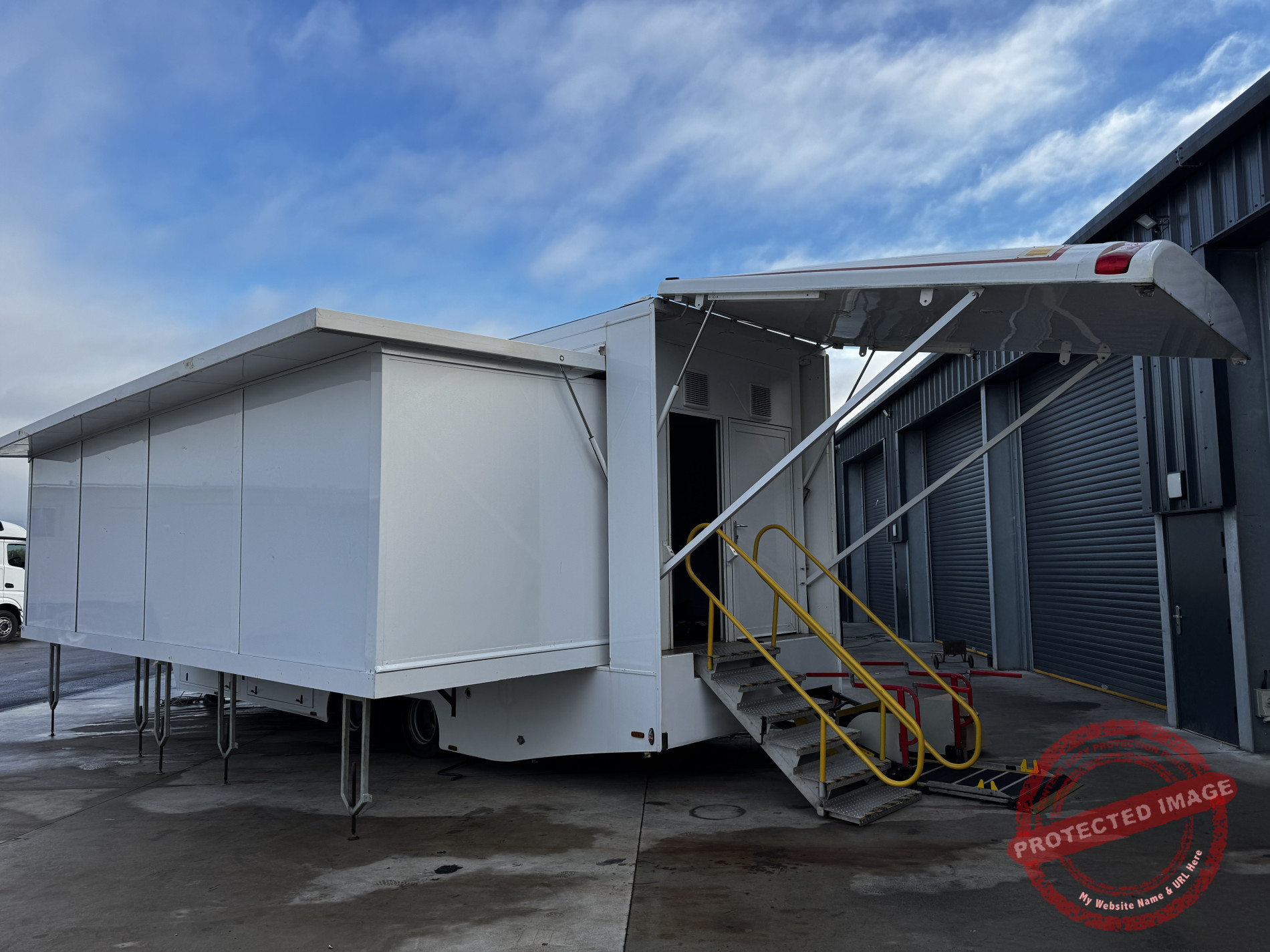 We have one unit with a slide out pod on one side and a Gull wing with removable panels on the other side. The unit has a rear entrance with removable steps and full tail-lift for wheelchair/ hospital beds to go onboard the unit with a lift up canopy to cover the entrance area.