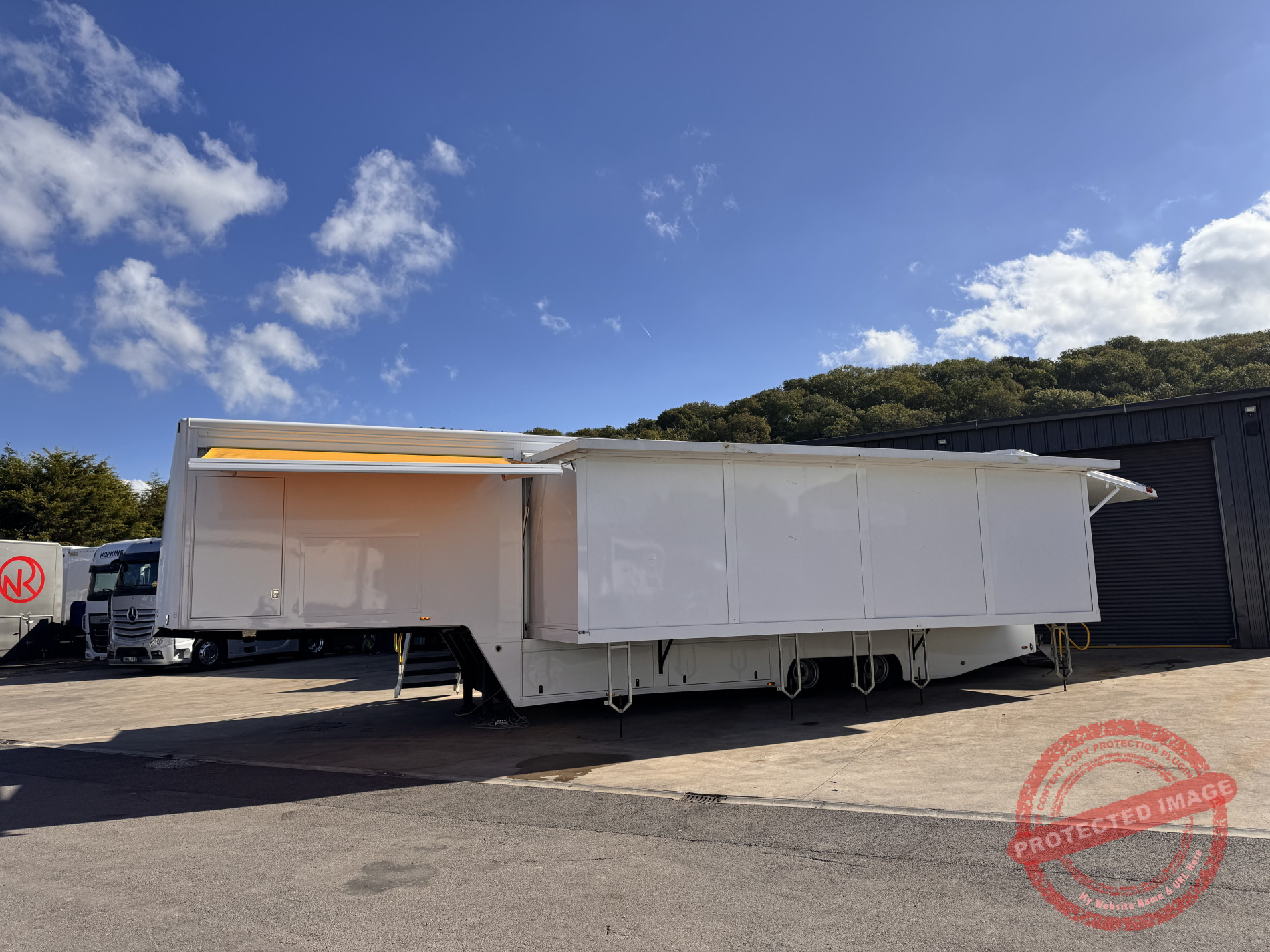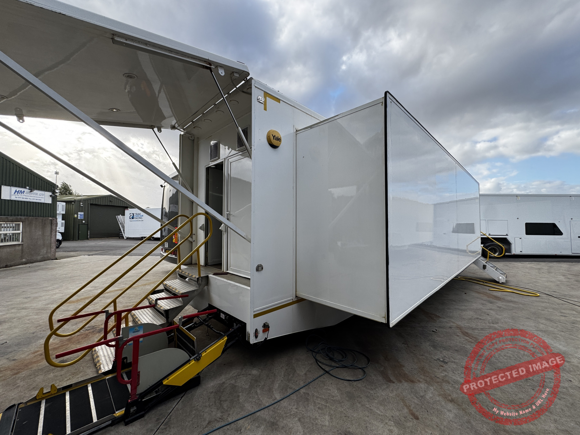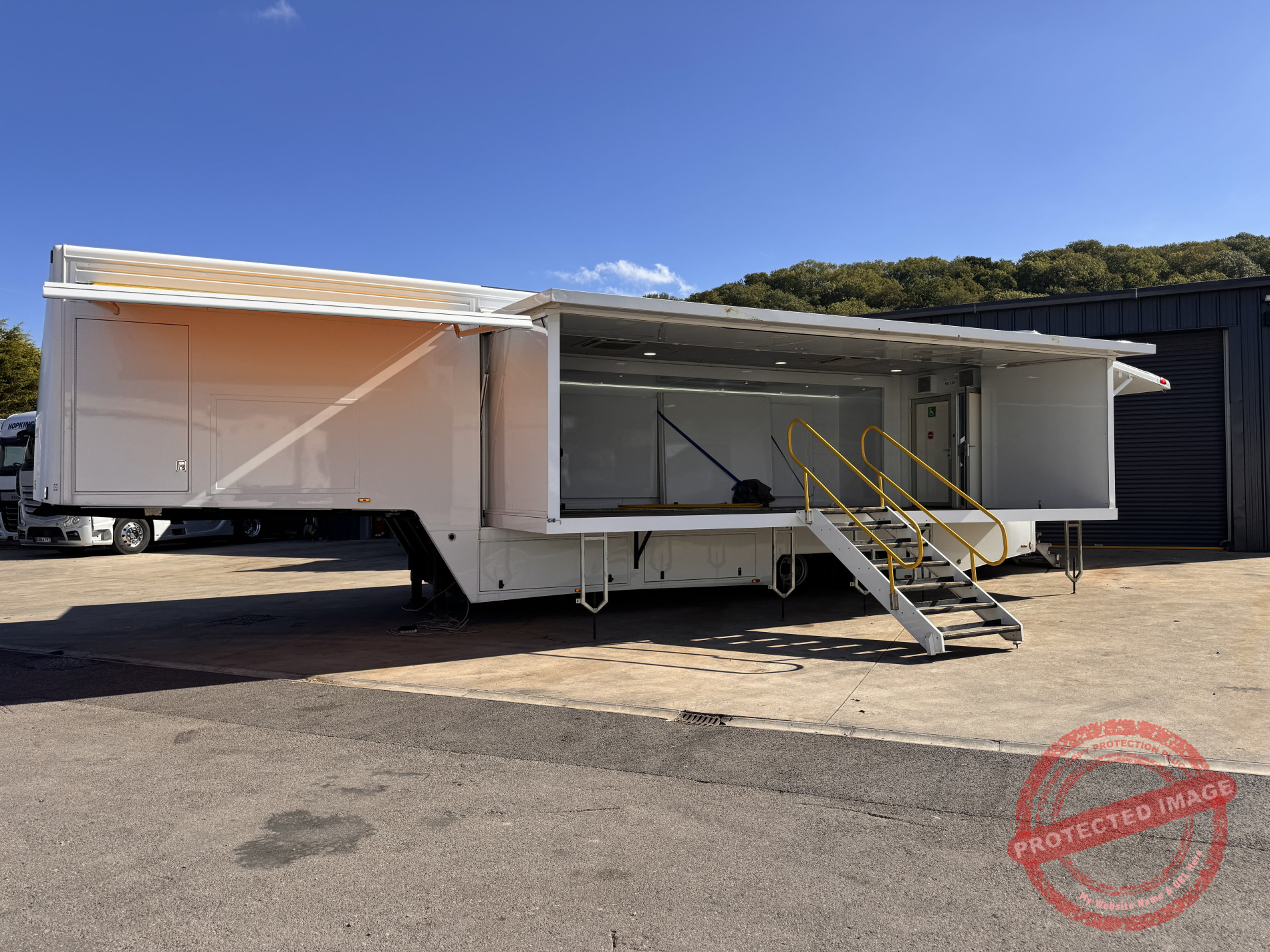 We have one unit with a slide out pod on one side and a Gull wing with removable panels on the other side. The unit has a rear entrance with removable steps and full tail-lift for wheelchair/ hospital beds to go onboard the unit with a lift up canopy to cover the entrance area.